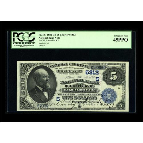 <B>Louisville, KY</B></I> - $5 1882 Date Back Fr. 537 <B>The NB of Kentucky</B></I> Ch. # (S)5312<BR>A second <B>PCGS Extremely Fine 45PPQ</B></I> whose visual appeal is well in advance of its technical grade. Don't be surprised to see this note, enhanced by Leviathan margins, sell for a realization consistent with at least the Choice CU grade, if not higher. In fact, this example has the kind of boardwalk more typically seen only on notes assigned the 68 grade.<BR><BR><b>Shipping:</b> Coin/Currency (<a target="_blank" href="http://www.heritageauctions.com/common/shipping.php">view shipping information</a>)