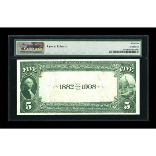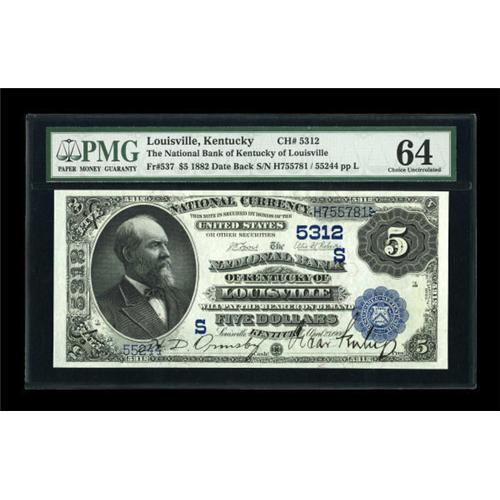 <B>Louisville, KY</B></I> - $5 1882 Date Back Fr. 537 <B>The NB of Kentucky</B></I> Ch. # (S)5312<BR> Behemoth margins and brilliant white paper give this near-Gem the look of a fully Superb issue. The signatures and brightly colored blue overprint add to the overall aesthetic appeal. <B>PMG Choice Uncirculated 64.</B></I><BR><BR><b>Shipping:</b> Coins & Currency (<a target="_blank" href="http://www.heritageauctions.com/common/shipping.php">view shipping information</a>)