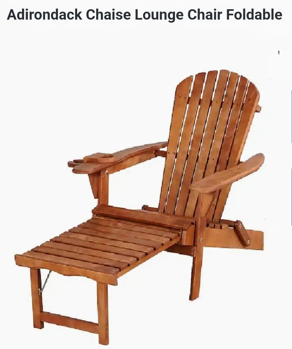 Foldable Adirondack chaise lounge chair in natural wood finish, ideal for outdoor relaxation, new.