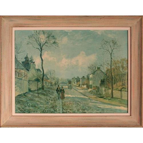 ?The Road to Louveciennes? is a beautiful print of Pissarro?s original painting of a couple walking along a quiet, snowy road. The road is lined by the quaint village homes and businesses overcast in blue tones by the wintery sky. The print is handsomely mounted in a uniquely finished frame with a multicolor wash to bring out the varying flecks of color within the composition. The inner fillet of the frame is a more crisp white that compliments the soft whites of the snow. Including the frame this piece measures 26 ¼?x 20 ½? and would be a wonderfully affordable way to bring a taste of the impressionist masters to your home.