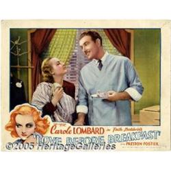 <B>Love Before Breakfast (Universal, 1936)</B></I> Lobby Card (11" X 14"). Based on "Spinster Dinner," a Faith Baldwin novel, this romantic comedy stars Carole Lombard as a sophisticated Park Avenue beauty who's being courted by two suitors, Preston S. Foster and Cesar Romero. There are multiple pinholes in the corners and borders, light smudge marks, and minor surface abrasions. The border art features the famous 30s illustration of the lascivious Lombard sporting a black eye. Fine.