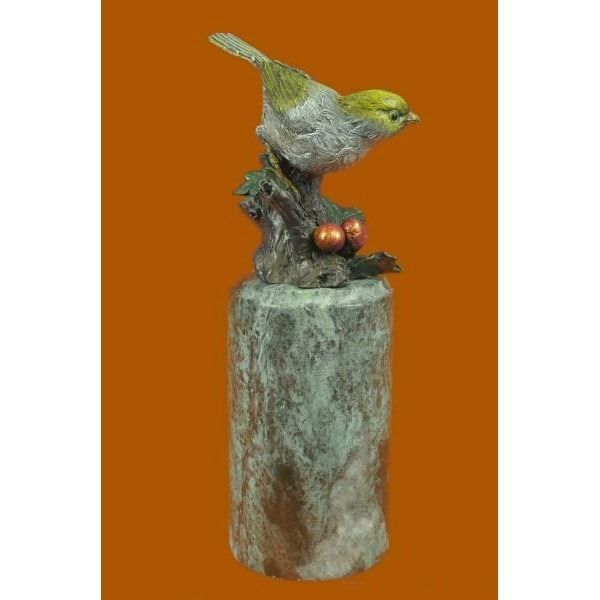 Birds of paradise, Perched on a brown marble base, the breathtaking multi color finch’s figurines are a testament to nature's beauty, featuring wings of vibrantly colored real bronze. This multicolor patina sculpture was cast using the lost wax method and mounted on a brown marble base. Bronze dimensions with marble base: Height 9 X Width 4 inches. Weight: 4 lbs.