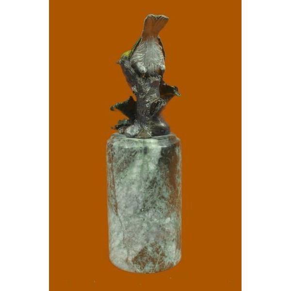 Birds of paradise, Perched on a brown marble base, the breathtaking multi color finch’s figurines are a testament to nature's beauty, featuring wings of vibrantly colored real bronze. This multicolor patina sculpture was cast using the lost wax method and mounted on a brown marble base. Bronze dimensions with marble base: Height 9 X Width 4 inches. Weight: 4 lbs.