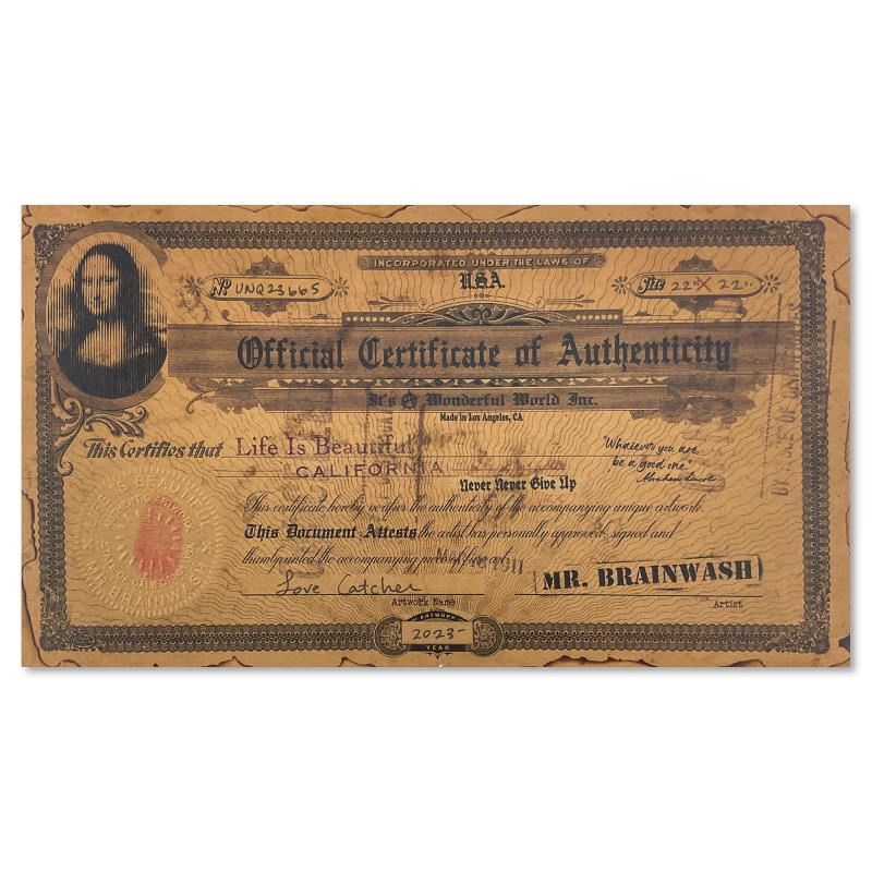 "Love Catcher" is a unique (UNIQ) mixed media on deckle edge paper by Mr. Brainwash, hand signed and bearing the thumbprint of the artist inverso. This piece comes custom framed. Includes Certificate of Authenticity. Measures approx. 26" x 26" (frame), 22" x 22" (image). This item requires special handling and may have a longer than usual turnaround.