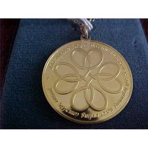 This pretty necklace bears a lovely sentiment. On one side it says "like my love for you, this true love's knot is still beginning, never ending, , complete, eternal. The other side has an intricate floral design along with the knot. This necklace includes a chain and is in its presentation box from Franklin Mint. Shipping to US adresses is $4