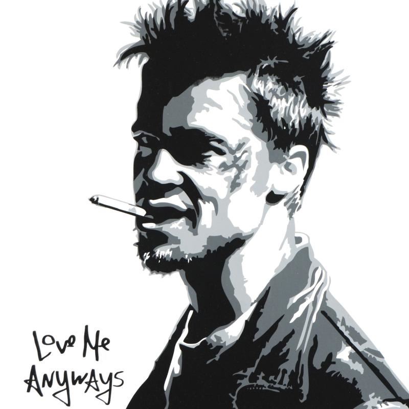 "Love Me Anyways" is a limited edition silkscreen serigraph on paper, numbered hand signed by the artist. This piece features Brad Pitt as Tyler Durden from "Fight Club". Includes Certificate of Authenticity! Measures approx. Measures approx. 20" x 24" (with border); 16" x 19" (image).