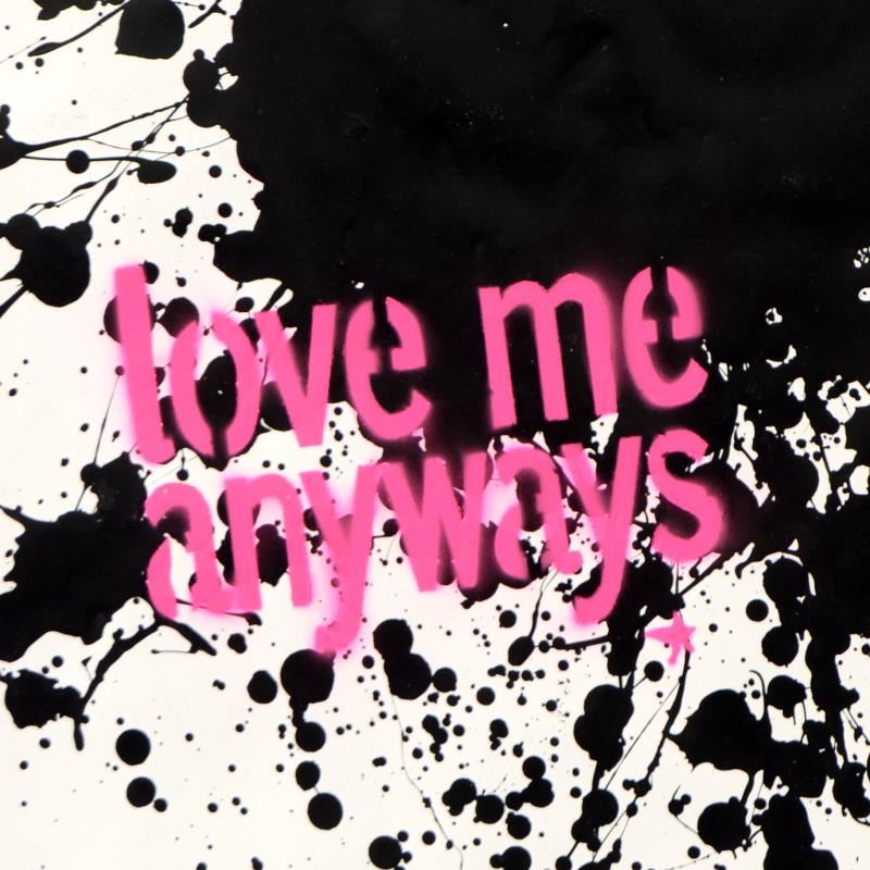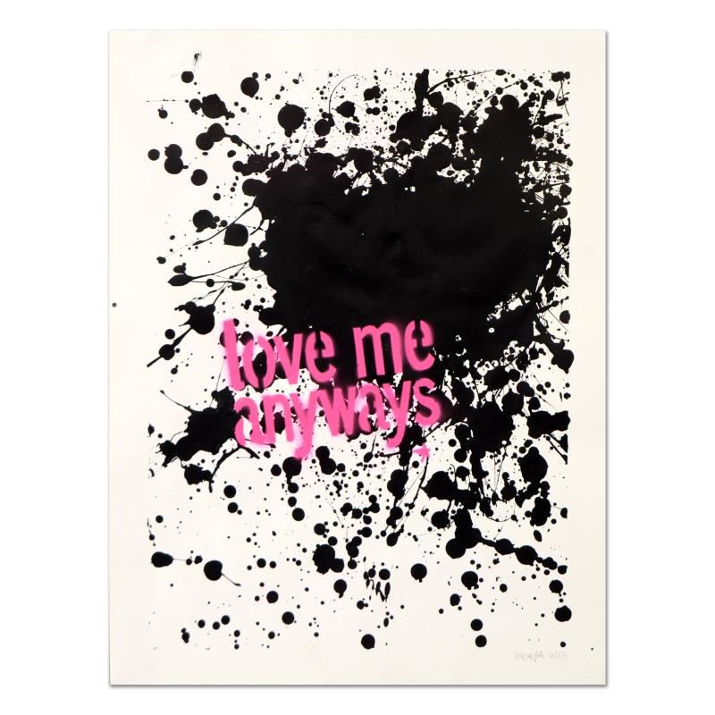 "Love Me Anyways" is a hand painted unique variation silkscreen on archival paper numbered 6/12 hand signed by the artist. Includes Letter of Authenticity. Measures approx. Measures approx. 18" x 24" (image).