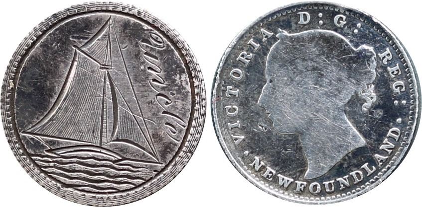 Love Token; Nfld 10¢ with Victoria portrait, "Bluenose" neatly engraved made for "Uncle".