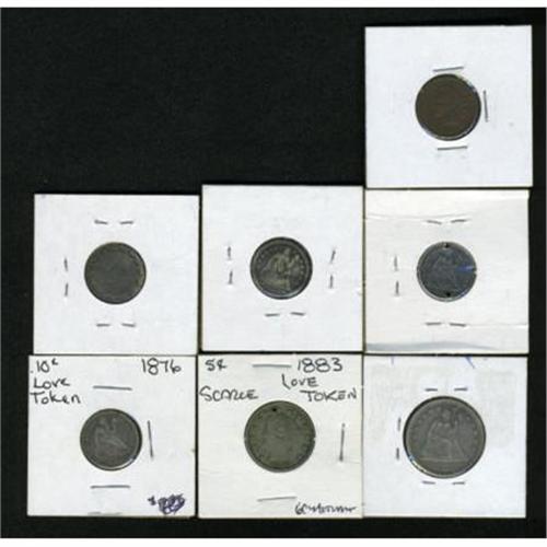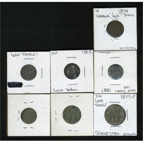 <B>Love Token Septet.</B></I> Includes an 1876 Indian cent, 1883 Liberty nickel, four dimes, and an 1877 Seated Liberty quarter.<BR><BR><b>Shipping:</b> Coins & Currency (<a target="_blank" href="http://www.heritageauctions.com/common/shipping.php">view shipping information</a>)
