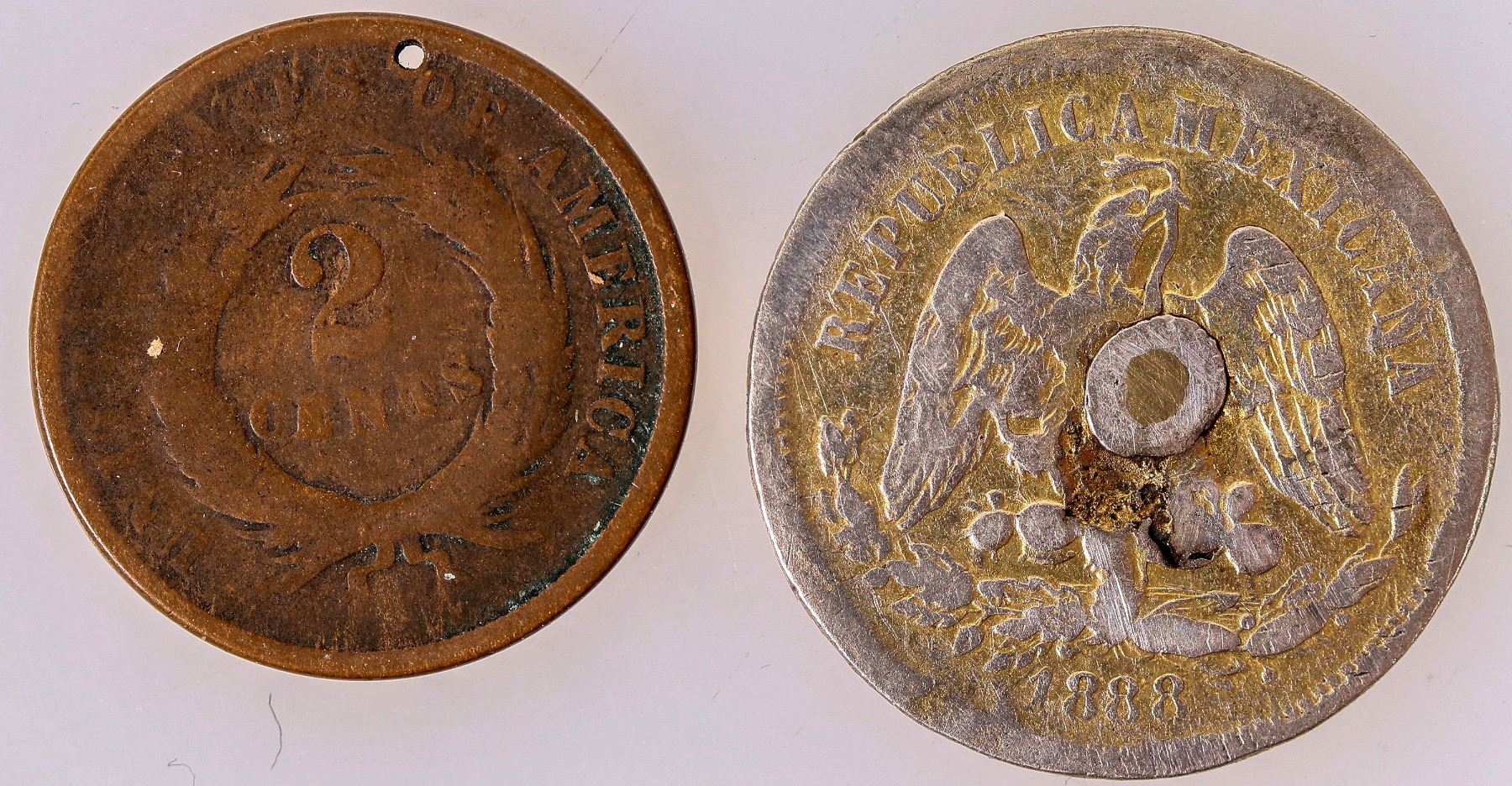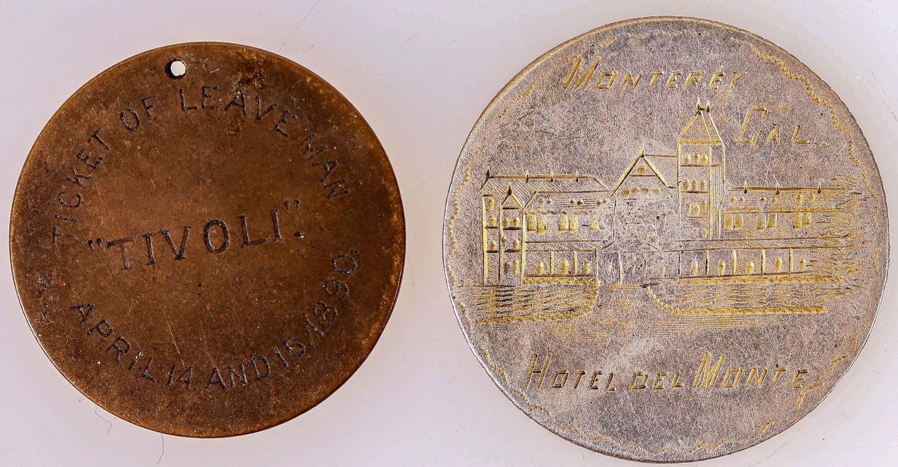 Lot of two love tokens: 1) Hotel Del Monte Monterey engraved on the reverse of an 1888 Mexican 25 centavo silver coin. 2) Ticket of Leave Man / "Tivoli" / April 14 & 15, 1890 incuse engraving on an undated U. S. two cent piece.