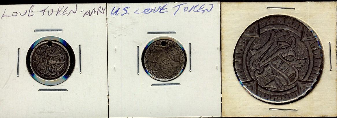 Love Tokens. Lot of 3 coins including Canadian Victorian 10¢, US 1875 half dime and US Morgan dollar. Should be viewed.