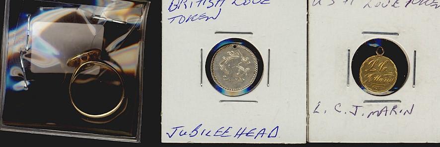 Love Tokens. Set of three coins including, two US gold dollars, one example is mounted on a14kt gold ring and the other is mounted for neck chain and has L.C.J. Marin inscripted on reverse. Also includes a British Love Token with Jubilee head.