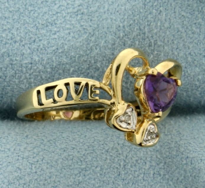In 10k yellow and white gold. Contains a heart shaped 5x5mm natural amethyst gemstone with bright purple color and excellent clarity. Also contains two high quality .005ct diamonds. Size 5. 2.2g.