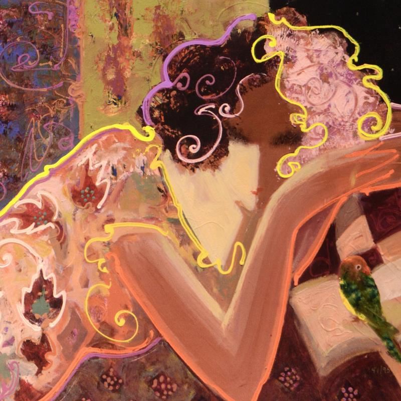 "Love and Poetry" is a limited edition hand embellished giclee on canvas by Sabzi, numbered and hand signed by the artist. This piece has a 2" border and can be gallery wrapped or framed. Includes Certificate of Authenticity. Measures approx. 48" x 24" (image).