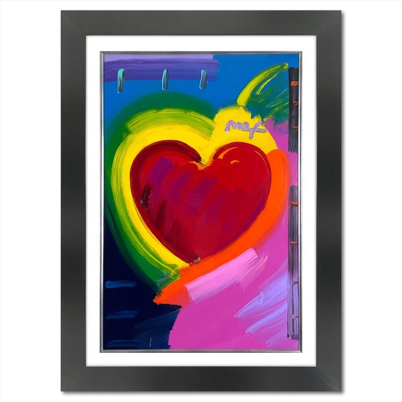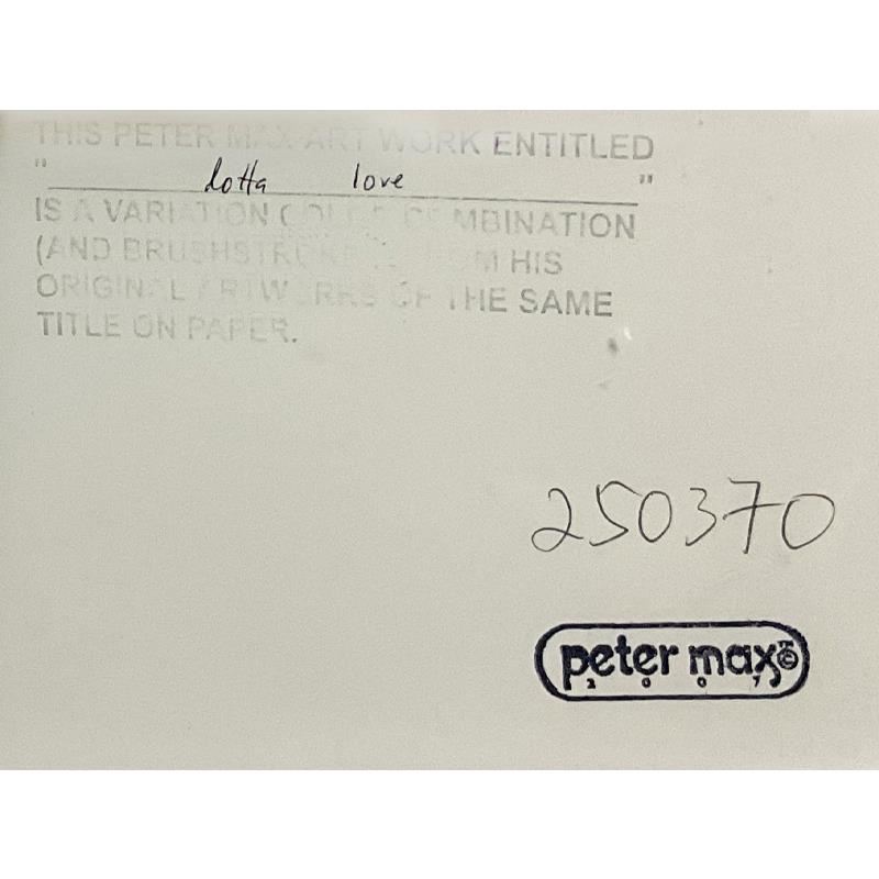 Love by Peter Max. Please see photos and description for all available information. "Love " is a one-of-a-kind acrylic mixed media on paper, hand signed by Peter Max. This piece comes custom framed. On the reverse side of this piece there is a registration number (250370) from Peter Max Studios certifying authenticity. Measures approx. 34" x 46" (frame), 23" x 35" (image).