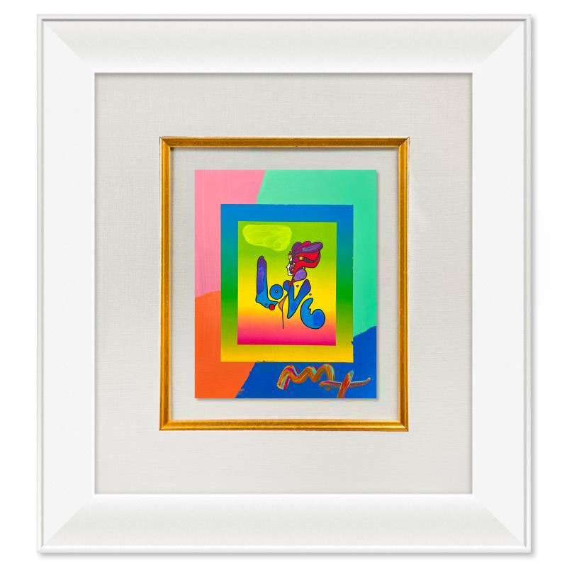 "Love" is a one-of-a-kind acrylic mixed media on paper, hand signed by Peter Max. The piece comes custom framed with a backside cutout to display Peter Max Studio registration number 230833 certifying authenticity. Measures approximately 24" x 22" (frame), 10" x 8" (image).