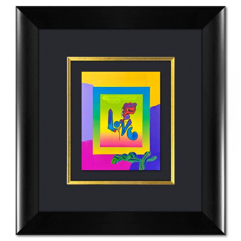 "Love" is a one-of-a-kind acrylic mixed media on paper, hand signed by Peter Max. The piece comes custom framed with a backside cutout to display Peter Max Studio registration number 230828 certifying authenticity. Measures approximately 24" x 22" (frame), 10" x 8" (image). This item requires special handling and may have a longer than usual turnaround.