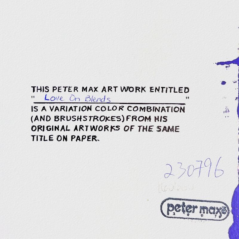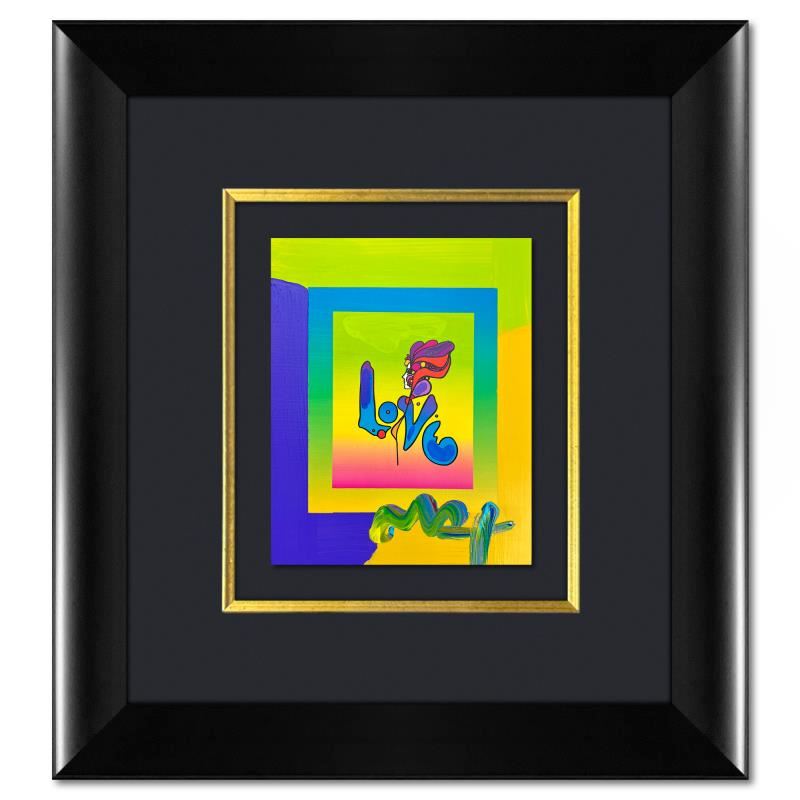 "Love" is a one-of-a-kind acrylic mixed media on paper, hand signed by Peter Max. The piece comes custom framed with a backside cutout to display Peter Max Studio registration number 230796 certifying authenticity. Measures approximately 24" x 22" (frame), 10" x 8" (image). This item requires special handling and may have a longer than usual turnaround.