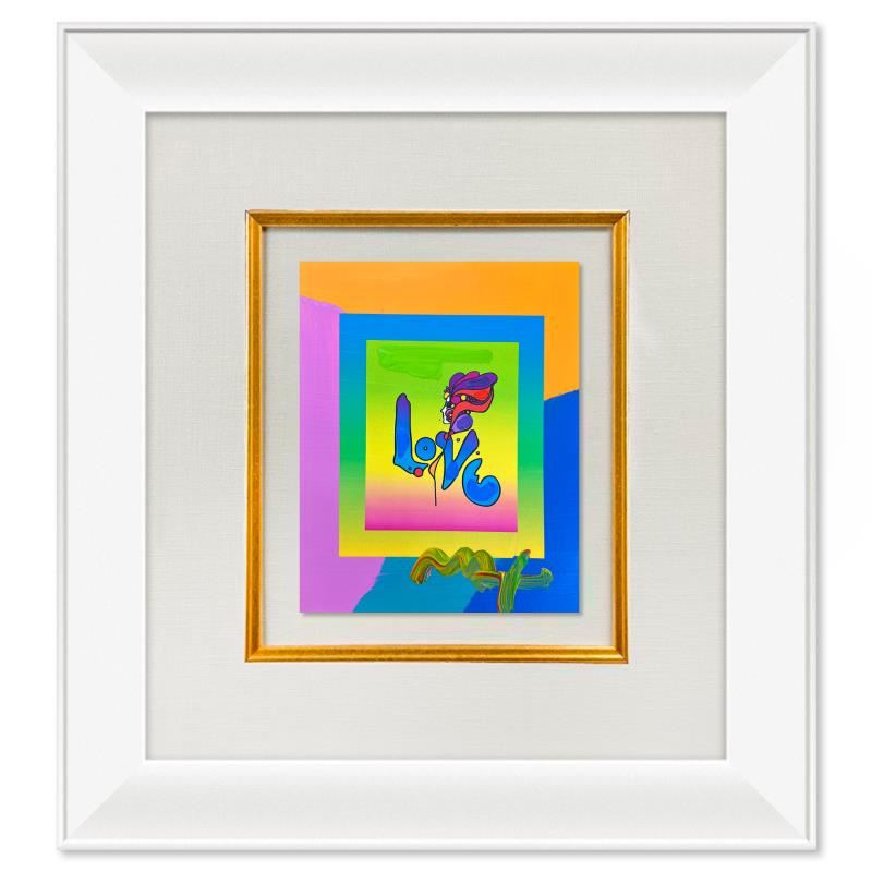 "Love" is a one-of-a-kind acrylic mixed media on paper, hand signed by Peter Max. The piece comes custom framed with a backside cutout to display Peter Max Studio registration number 231807 certifying authenticity. Measures approximately 24" x 22" (frame), 10" x 8" (image). This item requires special handling and may have a longer than usual turnaround.