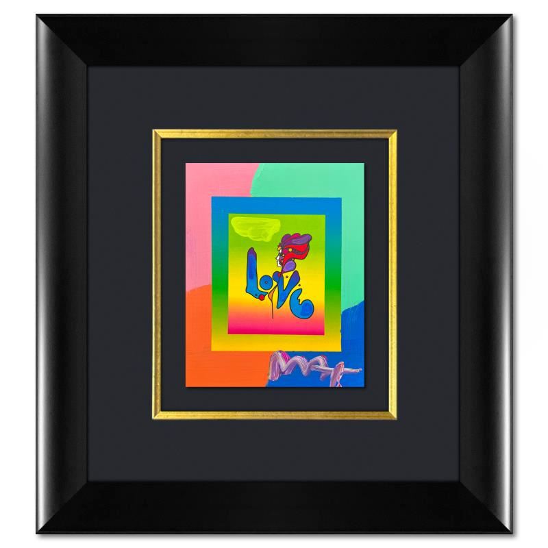 "Love" is a one-of-a-kind acrylic mixed media on paper, hand signed by Peter Max. The piece comes custom framed with a backside cutout to display Peter Max Studio registration number 230834 certifying authenticity. Measures approximately 24" x 22" (frame), 10" x 8" (image). This item requires special handling and may have a longer than usual turnaround.