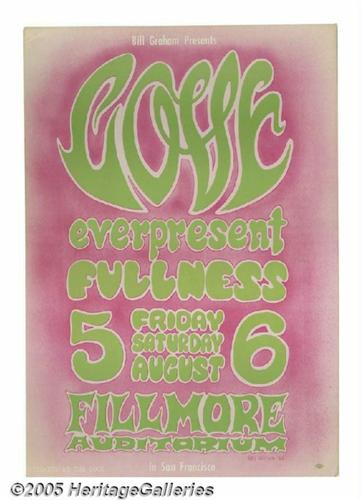 <B>Love with Everpresent Fullness Fillmore Poster # BG21, 8/5-6/66 (Bill Graham, 1966).</B></I> Here's an early San Francisco appearance from one of the top Los Angeles bands of the mid-sixties, Love. Fronted by charismatic singer-guitarist Arthur Lee, Love has recently been reformed, touring to great success in America and Europe. Opening for Love became the high mark for the band Everpresent Fullness, best known for their Warren Zevon-penned debut single "Wild About My Lovin'"; they disbanded shortly after. Hot pink and neon green colors are typical of artist Wes Wilson's designs of the time. This 14" x 20" poster is flat and clean, but does display a small corner crunch on the lower right, and some minor wrinkles in the upper left. VG+.