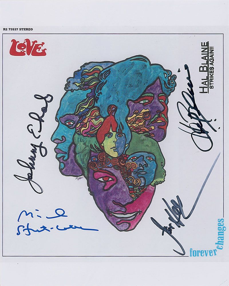 Color glossy 8 x 10 photo of Love’s landmark album Forever Changes, signed in blue and black felt tip by guitarist Johnny Echols, drummers Hal Blaine and Michael Stuart-Ware, and producer Jack Holzman. In fine condition.