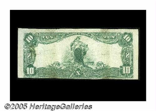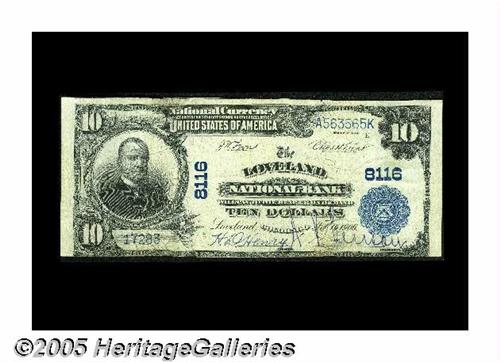<B>Loveland, CO</B></I> - $10 1902 Plain Back Fr. 625 <B>The Loveland NB</B></I> Ch. # 8116<BR>The scarcest of Loveland's three issuing banks, with this institution closed by the receiver in 1925. The census shows just eight examples extant from here, making this piece certain to see some action before the hammer falls this evening. <B>Fine+++,</B></I> with the bottom margin a hair trimmed in.