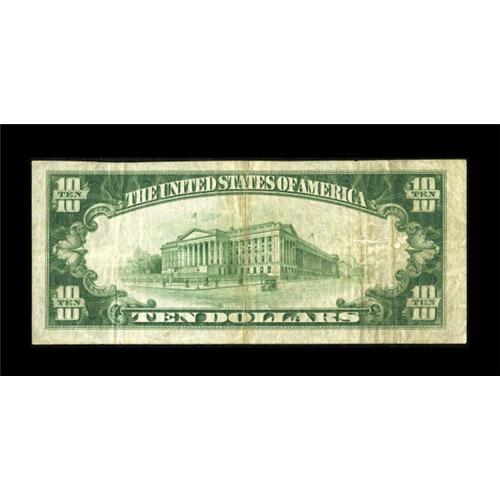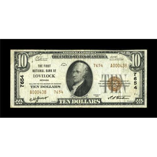 <B>Lovelock, NV</B></I> - $10 1929 Ty. 2 <B>The First NB</B></I> Ch. # 7654<BR> This note comes from one of the two most difficult towns in Nevada from which to obtain a Series 1929 example, the other being Tonopah (which is even scarcer than Lovelock.) Track and Price reveals only one offering from this bank in the past decade, with that coming when a low grade Very Good example realized nearly $10,000 in a 2006 auction. This piece, new to the census and ensconced in the Kansas City collection for forty years, is an attractive, evenly circulated, and problem free example that is just the kind of note that every collector desires. <B>Fine-Very Fine,</B></I> and rare enough to easily exceed the five figure mark early in the bidding. <BR><I>From The Kansas City Collection.</B></I><BR><BR><b>Shipping:</b> Coins & Currency (<a target="_blank" href="http://www.heritageauctions.com/common/shipping.php">view shipping information</a>)