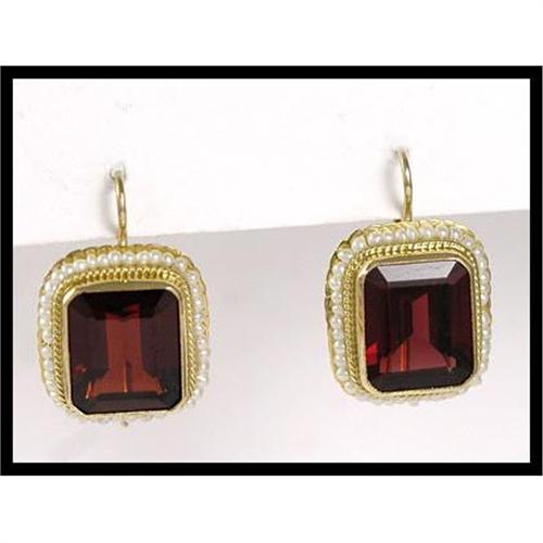 </font></strong>Lovely earrings with 2 emerald cut garnets surrounded by 82 seed pearls set in 14K yellow gold. The earrings measure 20.2 millimeters (0.79 inches) x 13.4 millimeters (0.53 inches) with hoop and weigh 4.00 grams total weight.</font>