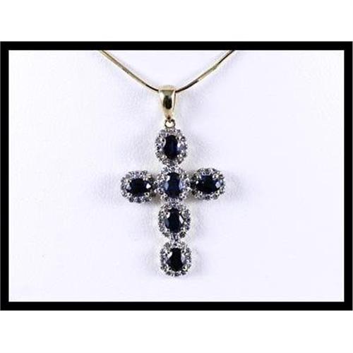Lovely cross pendant with 6 sapphires that weigh 1.85 carats and 72 diamonds that weigh 0.45 carats set in 18K yellow gold. The pendant measures 9/16 inches) wide x 1-1/4 inches long with bale and weighs 2.60 grams total weight.