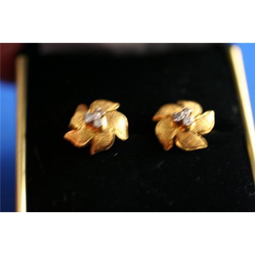 <table width="100%" border="0" cellspacing="0" cellpadding="4"><tr><td><em> Absolutely beautiful! Simple and elegant!</em></td></tr><tr> <td width="100%"> Lovely flowers of 18K yellow gold with three 2 pt diamonds in each. French clip backs for pierced ears. They weigh 2.0 grams. </td></tr><tr> <td> </td></tr><tr> <td>Reference #: E32</td></tr><tr><td>Condition:Excellent</td></tr><tr><td>Year:post 1950</td></tr><tr><td>Height:.6</td></tr><tr><td>Width:.6</td></tr><tr><td>Title:Lovely 18K Yellow Gold and Diamond Earrings</td></tr><tr><td>Materials:18K Yellow Gold, diamonds</td></tr><tr><td>Location:Minneapolis, Minnesota</td></tr></table>