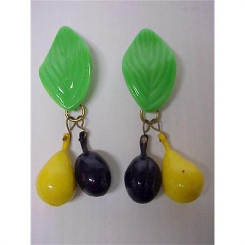 Bright green, Yellow and black are the colors that were these earrings made, from hard plastic, These are clip-ons and marked W.Germany,High quality, made to last.Love the dangling fruit and bright green leaves.Each is 3 inch long.Excellent condition, free of damage.US Buyer please pay 7.80 for insured shipping.We prefer Paypal payments.Thanks.