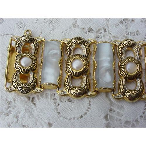 Lovely ladies bracelet,finished in gold tone and adorned with long opaque color "moon stones". US Buyer please pay 7.00 for shipping plus insurance,For International buyers shipping wold be more.Thank You for looking!