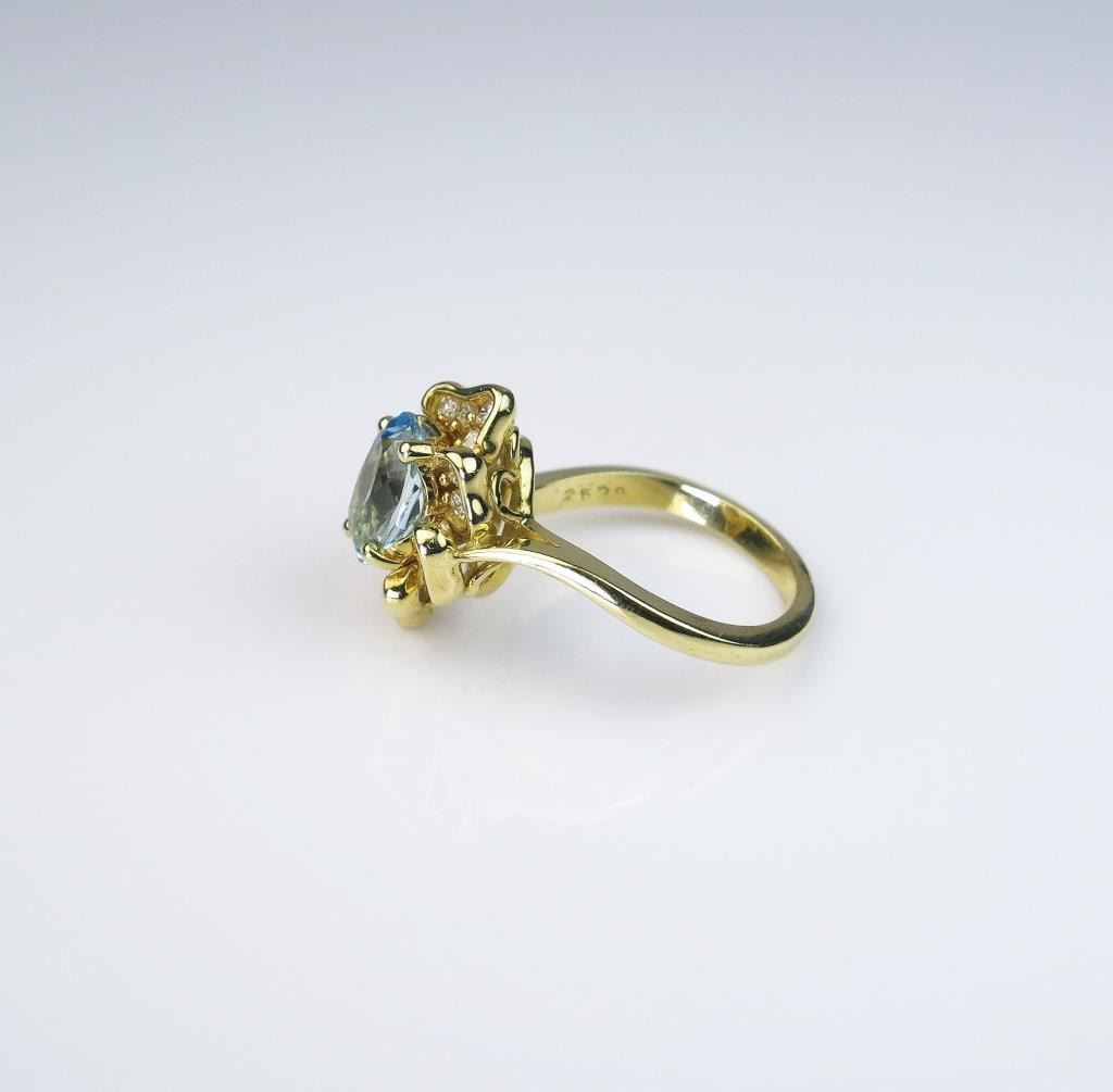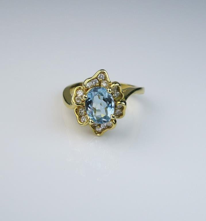 Lovely Aquamarine and Diamond Ring set in flower design featuring a quality 2.50 carat oval aquamarine framed with 16 Fine round cut diamonds weighing 0.50 carats with F-G colors and VVS clarity set in 18 karat yellow gold. Retail $2,500-$3,000 Estimate $1,500-$1,800