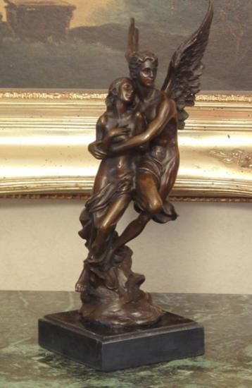 Guardian Angel, Bronze Sculpture After Ennis,12 1/2"H x 5"W x 5"D 12 lbs This bronze sculpture was produced using the "Lost Wax" casting method. The"Lost Wax" Cast method is the most precise metal casting technique in existence, ensuring exquisite detail of the original host model which is usually sculpted in clay or wax. This "Lost Wax" casting method is an extremely labor intensive and expensive process, but the end results produce a Heirloom Quality Masterpiece!A guardian angel is an angel assigned to protect and guide a particular person. The concept of tutelaryangels and their hierarchy was extensively developed in Christianity in the 5th century by Pseudo-Dionysius the Areopagite.The theology of angels, and tutelary spirits, has undergone many refinements since the 400s, and belief in both the East and the West is that guardian angels protect whichever person to whom God assigns them, and present prayers to God on that person's behalf.
