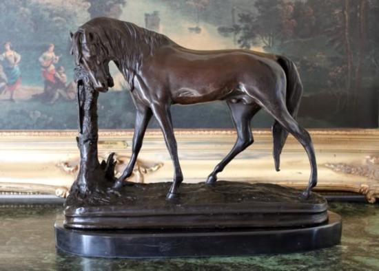 Horse and Tree Bronze Sculpture, After PJ Mene 12"H x 15"L x 7"D 25lbs. This bronze sculpture was produced using the "Lost Wax" casting method. The"Lost Wax" Cast method is the most precise metal casting technique in existence, ensuring exquisite detail of the original host model which is usually sculpted in clay or wax. This "Lost Wax" casting method is an extremely labor intensive and expensive process, but the end results produce a Heirloom Quality Masterpiece!Pierre Jules Mêne, (1810 -1879), was a French Sculptor and animalière. He is considered the pioneer of animal sculpture in the nineteenth-century.Mêne produced a number of animal sculptures, mainly of domestic animals including horses, cows and bulls, sheep and goats which were in vogue during the Second Empire. He was one of a school of French animalières which also included Rosa Bonheur, Pierre Louis Rouillard, Antoine-Louis Barye, Auguste Caïn, and François Pompon.His work was first shown in London by Ernest Gambart in 1849. Mêne specialized in small bronze figures which explains why none of his works exist as public statuary. His work was a popular success with the bourgeois class and many editions of each sculpture were made, often to decorate an increasing number of private homes of the period. The quality of these works is high, comparable to Barye's. Mêne also seems to have enjoyed a longer period of success and celebrity than his contemporaries. He is considered to have been the lost-wax casting expert of his time, later surpassed only by Auguste Rodin.