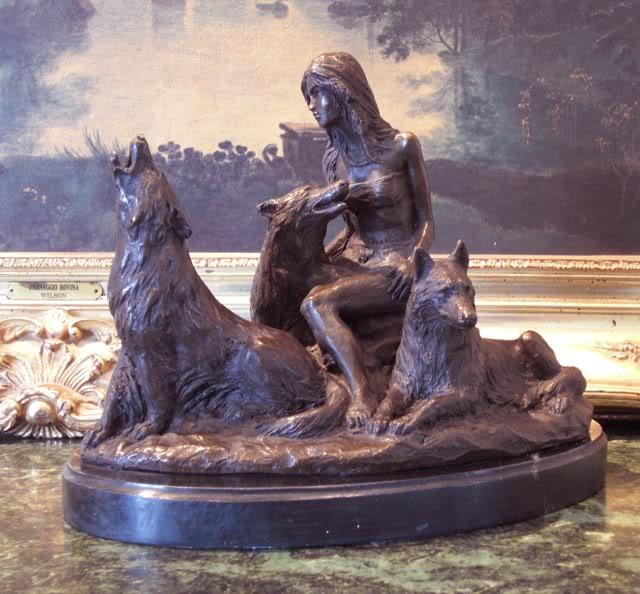 Woman and Wolves, Bronze Sculpture, 11"H x 14"W x 8"D 24lbs This bronze sculpture was produced using the "Lost Wax" casting method. The"Lost Wax" Cast method is the most precise metal casting technique in existence, ensuring exquisite detail of the original host model which is usually sculpted in clay or wax. This "Lost Wax" casting method is an extremely labor intensive and expensive process, but the end results produce a Heirloom Quality Masterpiece!