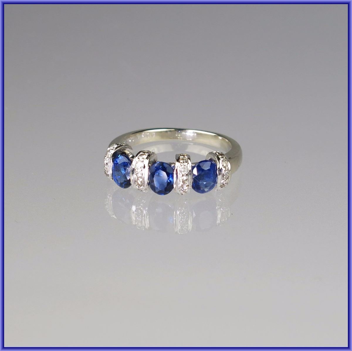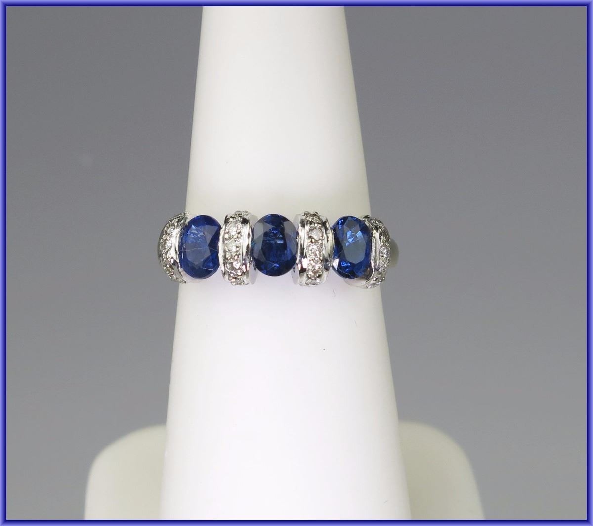 3 oval cut vivid blue sapphires weighing approx. 1.00 carat with 35 round cut Diamonds weighing approx. 0.40 carats total set in 14 karat white gold.