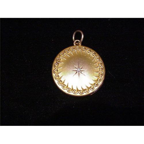 Lovely Circa 1900 14Kt yellow gold and diamond round locket decorated with repousse work border and eight-pointed star design with central small Old European Cut diamond. Reverse inscribed with cursive initials. Interior all present and original both frames intact. Great shape. Excellent Condition. Lovely old piece. We will include a gold chain with purchase. Great buy!!