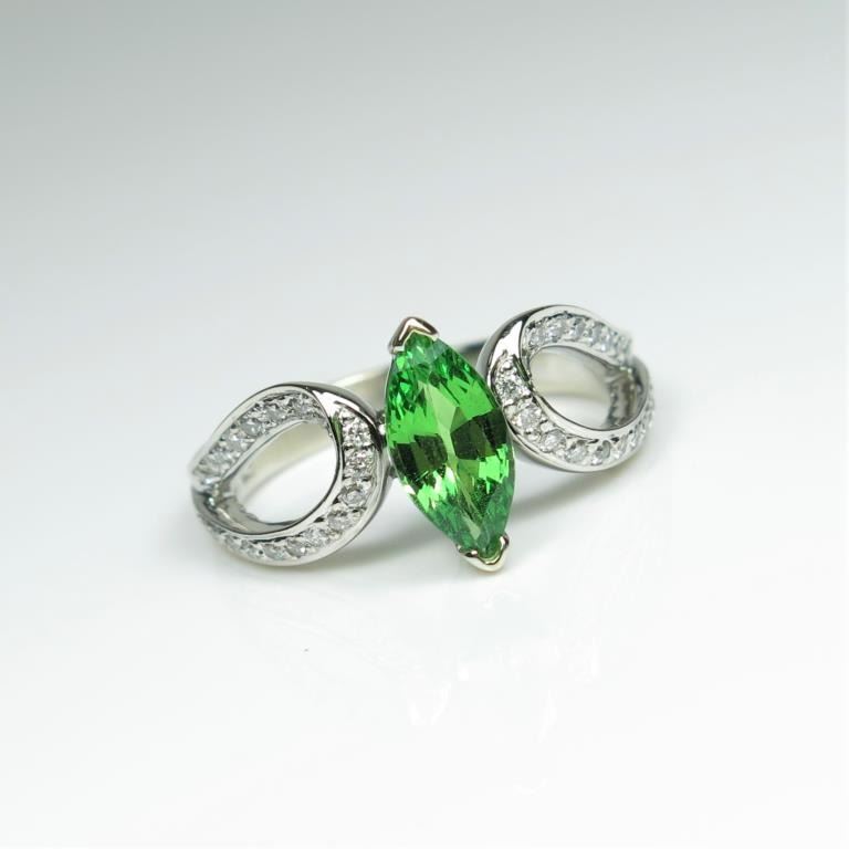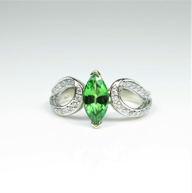 Lovely Contemporary Style Tsavorite Garnet and Diamond Ring featuring a Marquise cut Tsavorite weighing 1.10 carats fine set with 38 round accent Diamonds weighing approx. 0.30 carats with G-H colors and VS clarityset in 14 karat white gold. Retail $2,000-$3,000 Estimates $1,200-$1,800