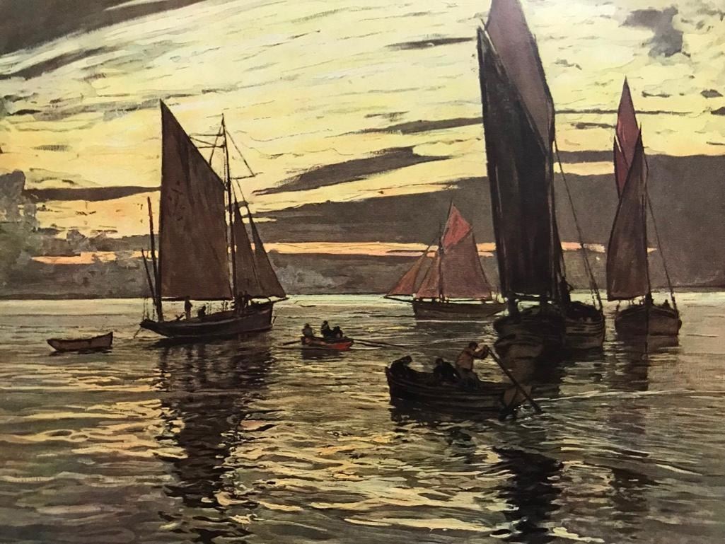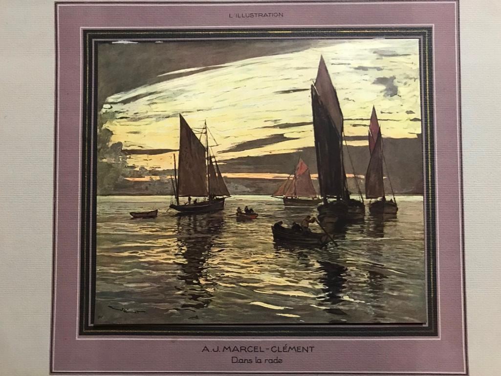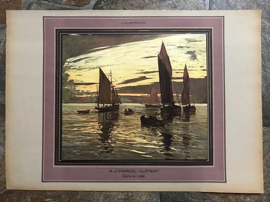 Amedee-Julien Marcel-Clement ( French 1873 - 1950 ) "Dans la rade" chromolith mounted on heavy stock paper, from a 1926 French magazine "L'Illustration". Sailing vessels in sunset scene.11" X 16" paper size. 8" X 9" image size. *small loss to surrounding edge that does not affect the scene itself. Â