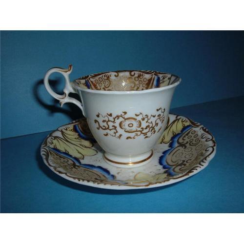 A lovely English cup and saucer with gold, blue and yellow decoration. The gold has become faded on the plate where the cup sits.