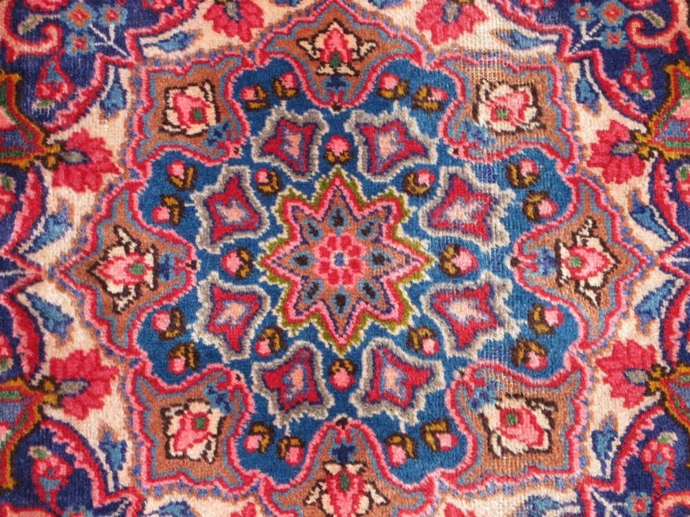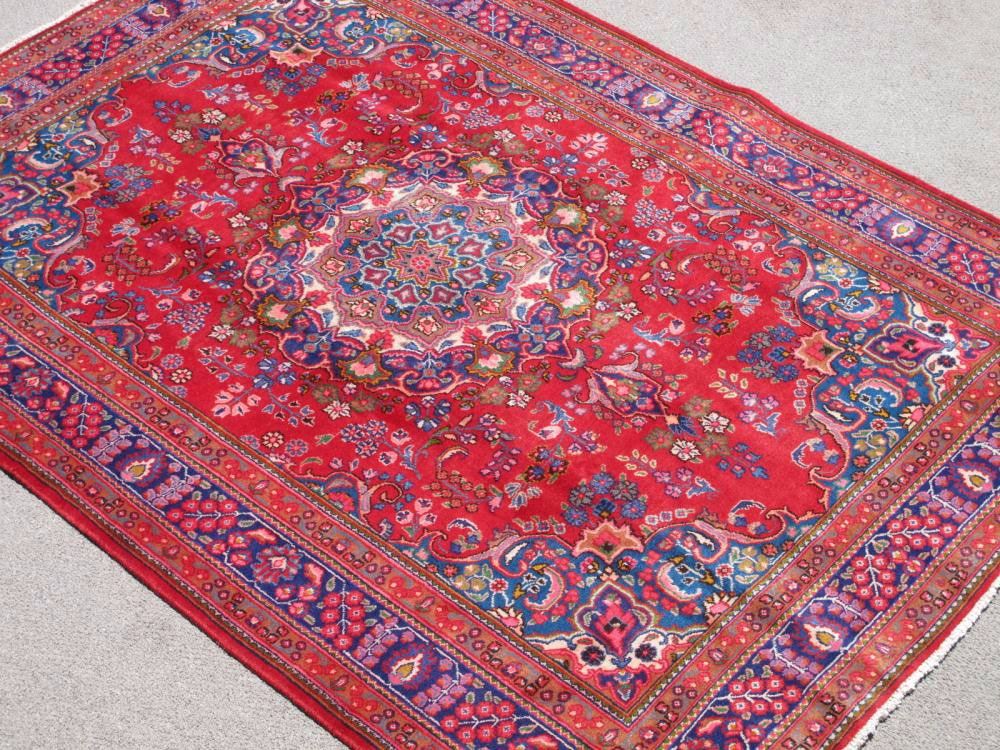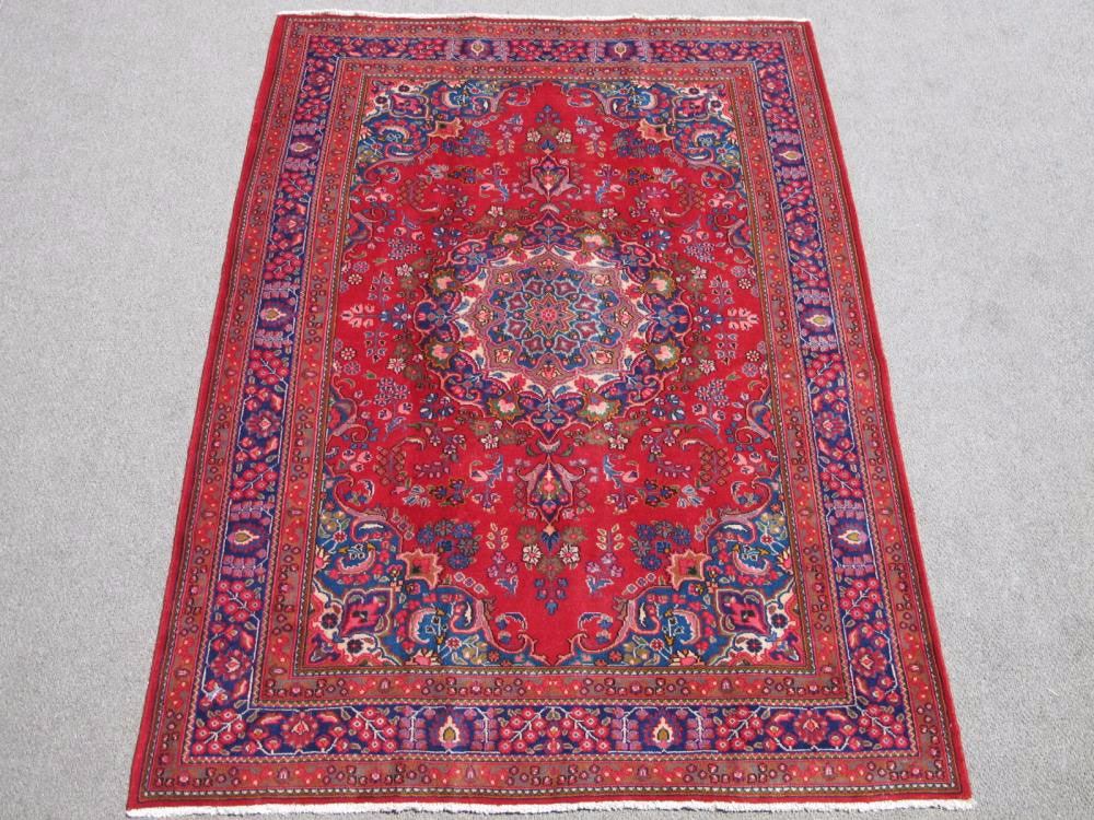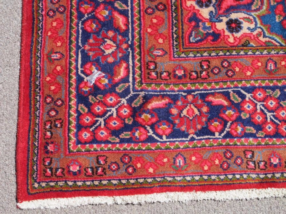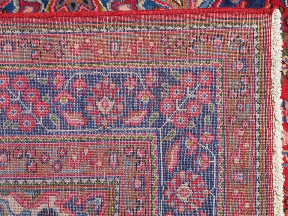 Rug: Handmade Semi Antique Mashhad; Material: Fine quality baby lamb's wool pile, all natural vegetable dye; Size: 9.5 x 6.7 feet; Foundation: Cotton; Design: Persian Mashhad; Origin: Iran