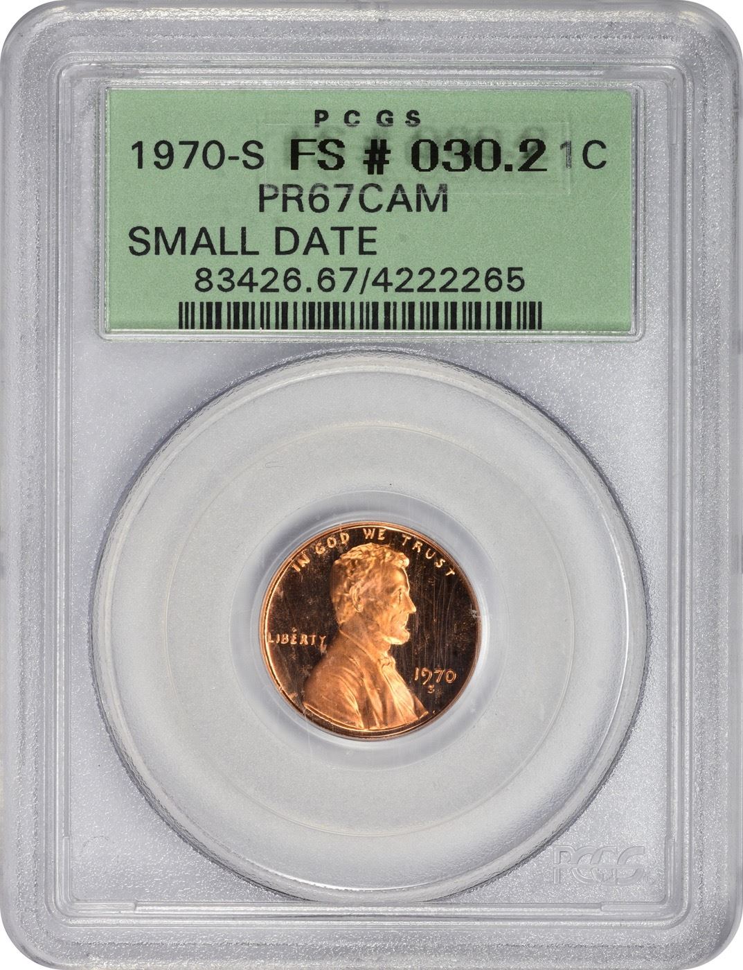 Lovely Gem Proof 1970-S Small Date Cent 1970-S Cent Small Date. FS-030.2. Proof-67 CAM. OGH. Fully RD but not noted on holder. Rich rose-orange throughout with mirrored fields and frosted devices. The cameo contrast is splendid, as is just about everything about this beauty. One for the specialists.