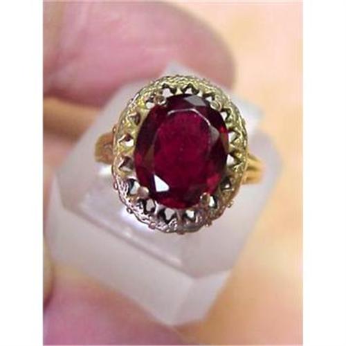 This is a lovely 10 ct.yellow gold ring made with great detail and adorned with one large oval garnet stone measuring about 5/16" - This ring seems to be 5 - Please include 6.00 for shipping plus insurance.- Thank You for looking.