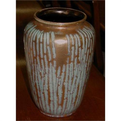 This deep goldish with blue design vase is probably pre-1950's. It is signed Germany #43517. There are no chips or cracks, but has some paint loss. It is dark brown inside. Buyer pays shipping and handling costs.