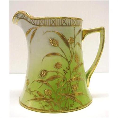 Beautiful jug, Made by NIPPON and hand painted, Love the gorgeous and rich gold decoration against shaded light green ground!, Excellent condition free of chips or cracks,but for the gold on the top of the handle and edge is thin. Measures about tiny bit over 5" tall - US Buyer please pay 7.00 for shipping + insce.Thank You very much for looking.
