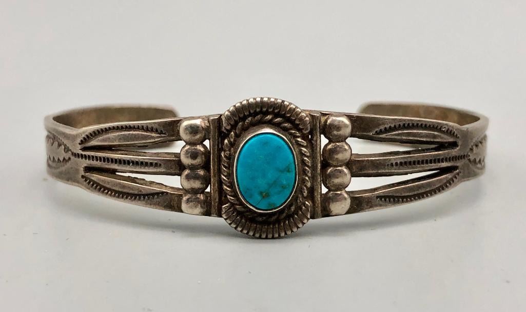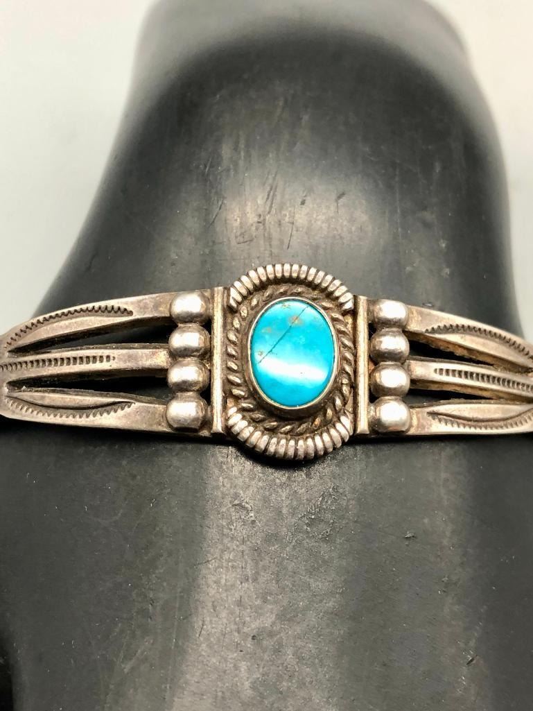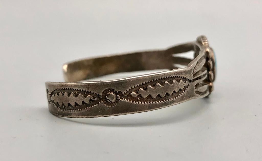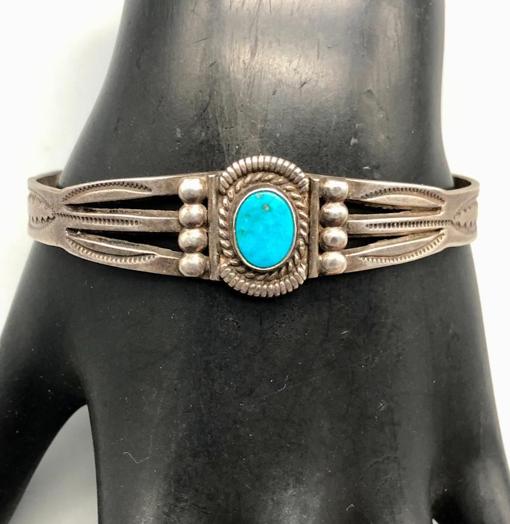 For sale in this lot is a lovely handmade turquoise bracelet. This is a beautiful bracelet with a nice older turquoise stone. It has different types of twisted wire around the bezel and nice silverwork. It is on a split shank style cuff with hand stamped designs. It is made from sterling silver. MAKER: Unmarked. APPROX AGE: Circa 1950s. SIZE: Inside circumference measures 5-1/2 inches long. Opening is an additional 1-1/4 inches, fitting a 6-3/4 inch wrist. Width is 3/4 inches. Weighs 19.1 grams. CONDITION: Good for its age, normal wear expected. Please look closely at the pictures as they are an important part of our description and are hereby incorporated into the description, specifically with regards to condition. SHIPPING: There will be a $5 handling / packaging fee for shipping this lot. The actual cost of postage will be added on top of that. BUY IT NOW: If you would like to buy this item now, without waiting for the auction day to bid on it, we do offer this option (which is available up to 48 hours before the actual auction starts). The “Buy it Now†price is the high estimate of this lot (plus applicable fees and the Buyer's premium is discounted to 10% when using the Buy it Now option). If you would like to exercise this option, you must contact us by email (or phone as long as you talk to someone live). Reference this lot number and your intention to "Buy it Now."