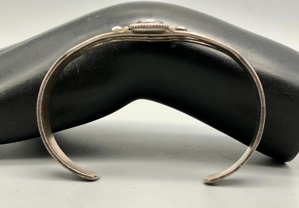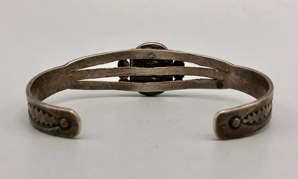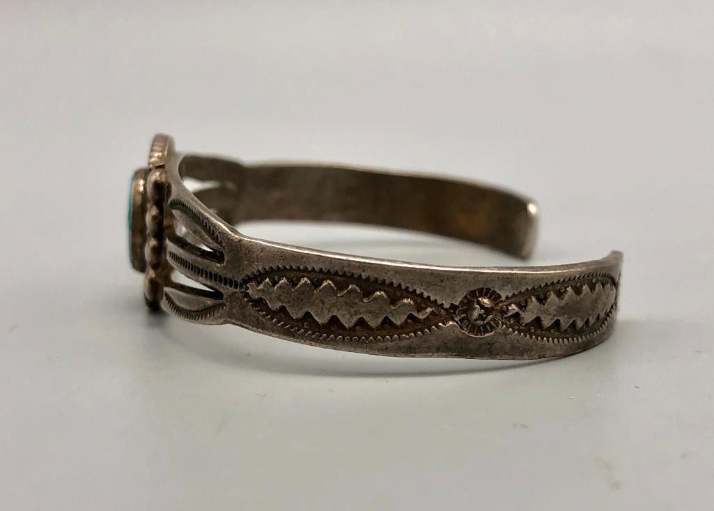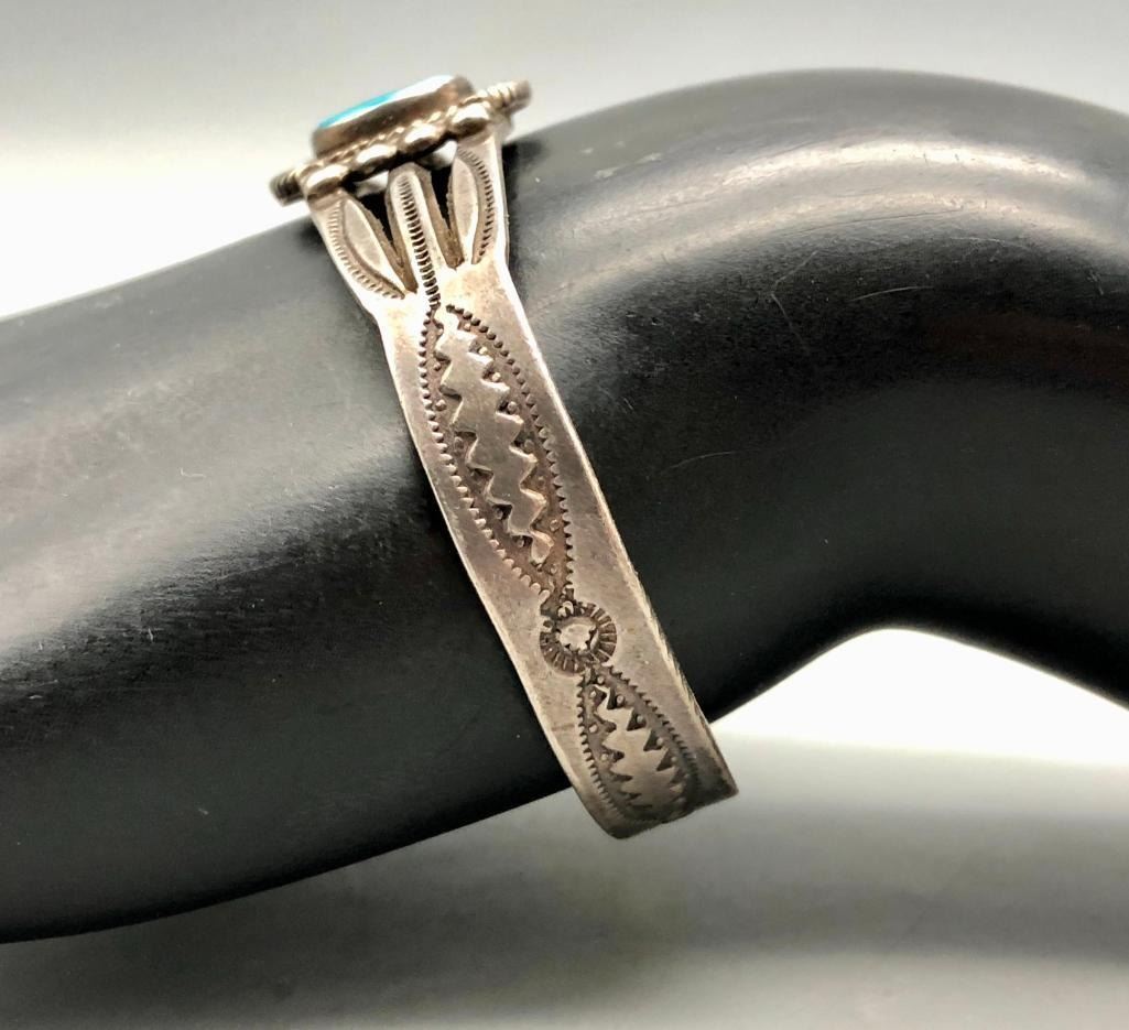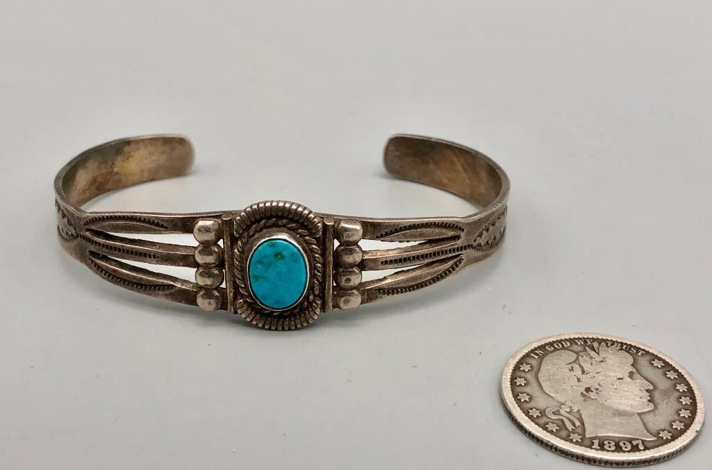 For sale in this lot is a lovely handmade turquoise bracelet. This is a beautiful bracelet with a nice older turquoise stone. It has different types of twisted wire around the bezel and nice silverwork. It is on a split shank style cuff with hand stamped designs. It is made from sterling silver. MAKER: Unmarked. APPROX AGE: Circa 1950s. SIZE: Inside circumference measures 5-1/2 inches long. Opening is an additional 1-1/4 inches, fitting a 6-3/4 inch wrist. Width is 3/4 inches. Weighs 19.1 grams. CONDITION: Good for its age, normal wear expected. Please look closely at the pictures as they are an important part of our description and are hereby incorporated into the description, specifically with regards to condition. SHIPPING: There will be a $5 handling / packaging fee for shipping this lot. The actual cost of postage will be added on top of that. BUY IT NOW: If you would like to buy this item now, without waiting for the auction day to bid on it, we do offer this option (which is available up to 48 hours before the actual auction starts). The “Buy it Now†price is the high estimate of this lot (plus applicable fees and the Buyer's premium is discounted to 10% when using the Buy it Now option). If you would like to exercise this option, you must contact us by email (or phone as long as you talk to someone live). Reference this lot number and your intention to "Buy it Now."