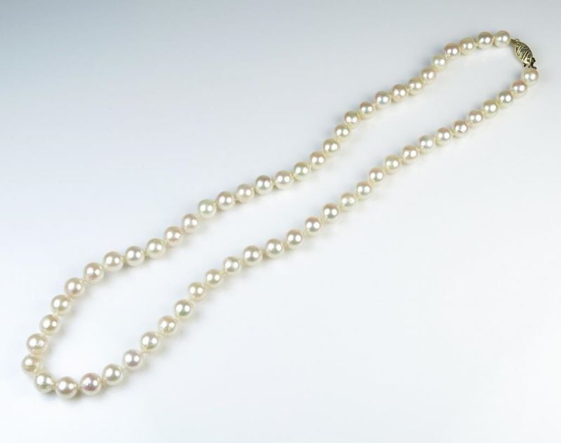 Measuring 18" long and averaging 7.00mm in diameters with 14 karat yellow gold clasp.
